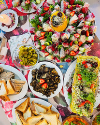 Eriline tänu kuulub meid toitlustanud Julia Anufrijevale ja tema abilisele Jaanikale, kes mõtlesid kastist välja ja pakkusid maitseküllaseid värvikaid toite, mis olid kõik viimse detailini kaunistatud. Juliaga kokku saades mainisin talle moka otsast, et minu visuaaliks on ilu ja naudingud ning mingeid kastrulle ma näha ei taha. Kohapeal selgus, et ta oli sõnasabast sedavõrd kinni haaranud, et pakkus meile üle võlli ilu ja naudinguid nii, et me kõndisime kööki ja seisime toidu järjekorras roosiõie kroonlehtede peal. Päriselt!